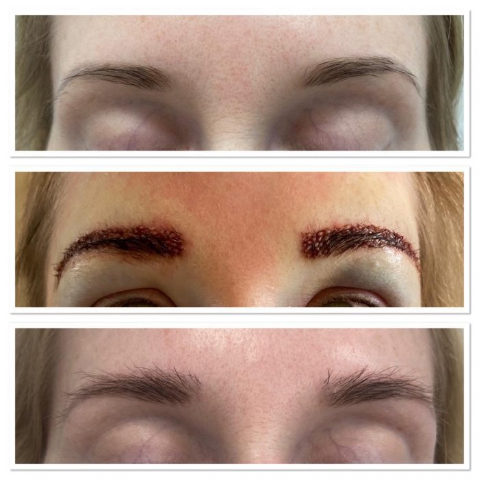После этого донорские волосы вставляются в истонченные участки бровей или вокруг всей области бровей для создания естественных бровей с помощью иглы для подкожных инъекций 23 калибра под микроскопом с большим увеличением.