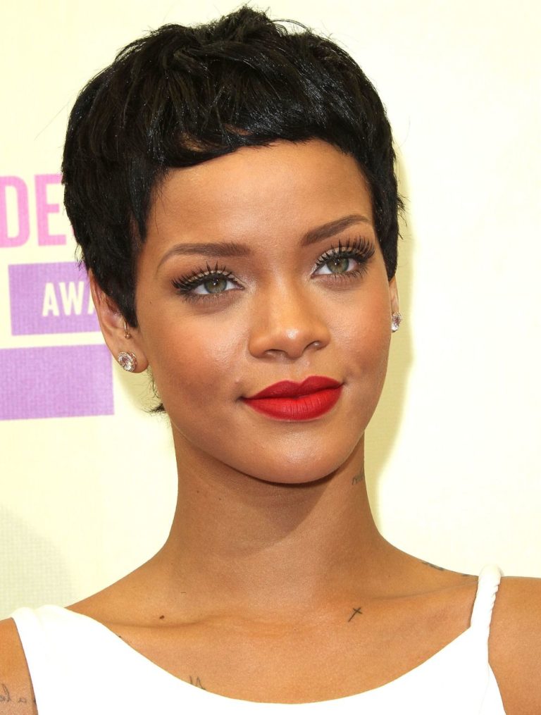 Короткую стрижку продвигает и Рианна, которая причесывает челку над глазами, непослушные пряди закрывают лоб, что добавляет прическе агрессивности, так что челка такая непослушная, нужно нанести на челку немного фиксирующего спрея, придайте волосам форму и, наконец, сбрызните лаком.