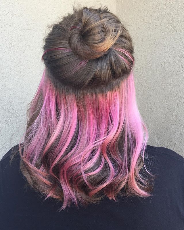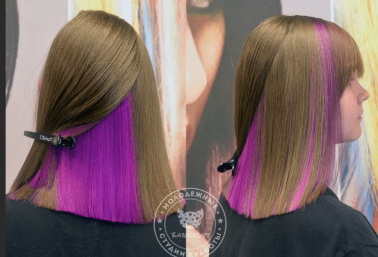 Скрытое окрашивание — это всего лишь блочное окрашивание волос, в котором пряди красятся блоками и зачастую в очень яркие цвета. Это совсем не обязательно, можно выбрать и нежные оттенки.