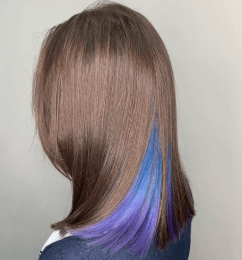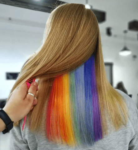 Светлые волосы – настоящее поле для экспериментов со скрытым окрашиванием. Любой цвет будет смотреться ярко и насыщенно. Блондинкам подойдут пастельные оттенки – розовый, голубой, лиловый. Также на светлых волосах будет отлично смотреться скрытое радужное окрашивание.