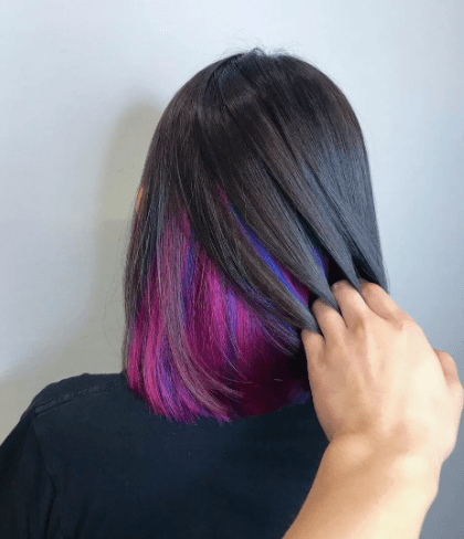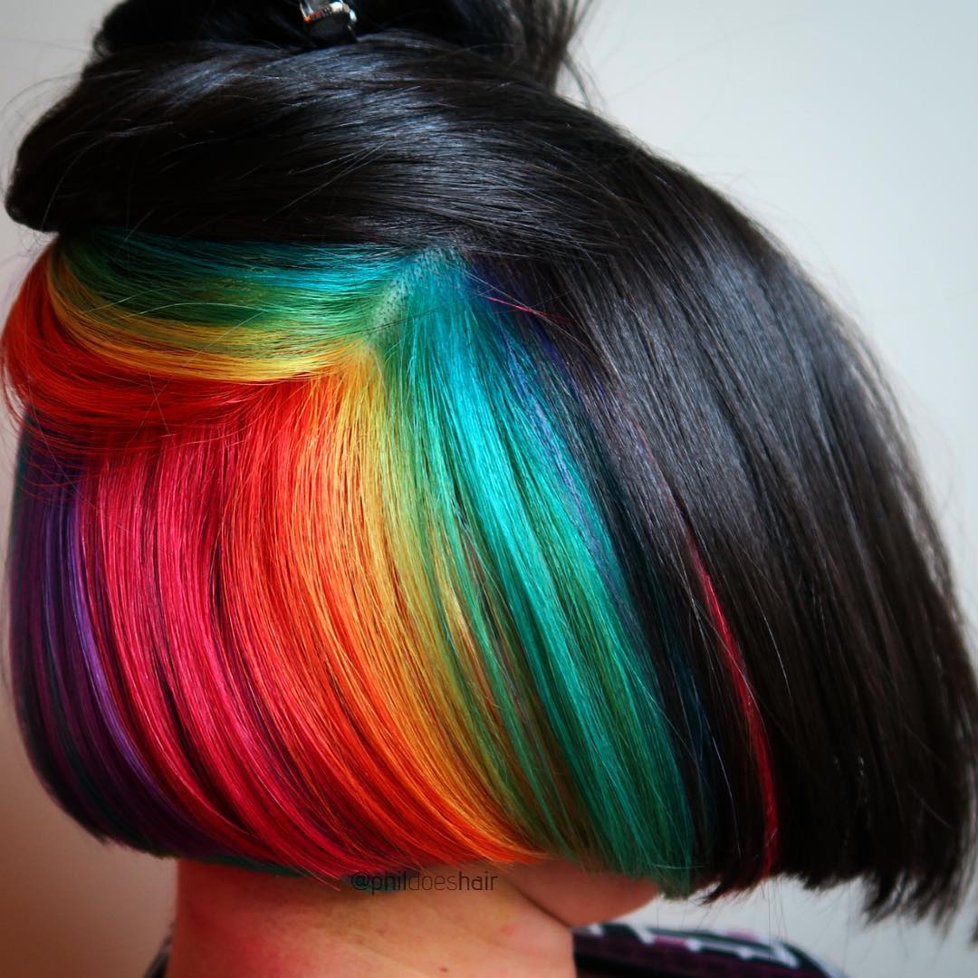 Это вариант для тех, кто не любит кардинальных изменений. Скрытое окрашивание можно заметить только в специально созданной прическе, при этом цветные блоки могут раскрыть индивидуальность: яркая прядь в челке или за ушами рассказывает о веселом и задорном нраве. Блочное окрашивание — легкий вариант пиксельного: прядь волос легче окрасить, чем рисовать геометрические, ровные рисунки на нескольких слоях волос.